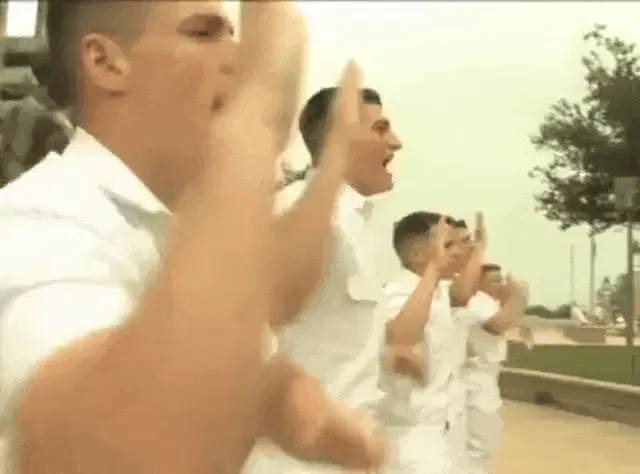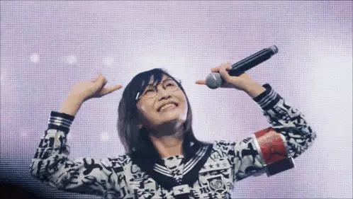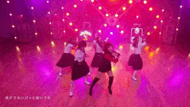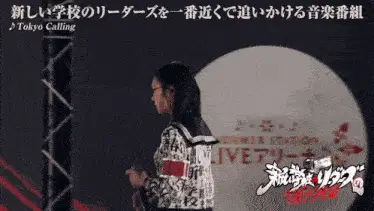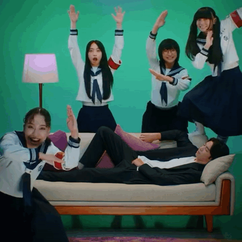 Atarashii Gakko! Leaders dance energetically around a man lying on a couch with a green background.
