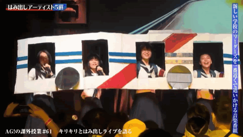 Atarashii Gakko no Leaders perform live on stage, appearing from a creative cardboard train prop.