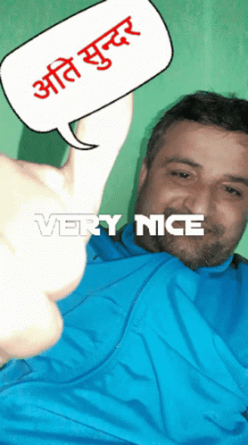 Man gives a thumbs up with a smile, featuring 'Very Nice' text and a Hindi caption 'अति सुंदर'.