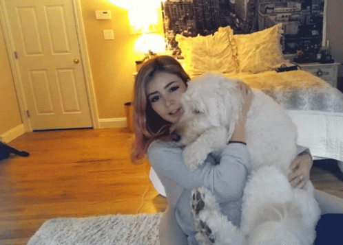 Chrissy Costanza lovingly embraces a fluffy white dog, holding it close in a warm hug.