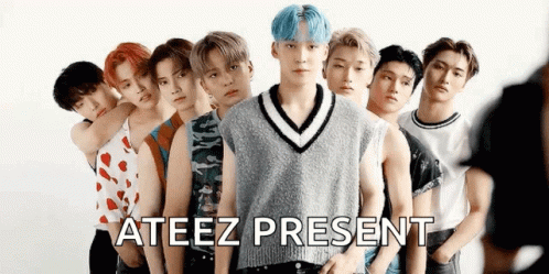 ATEEZ group photo featuring Hongjoong prominently, with 'ATEEZ PRESENT' text.