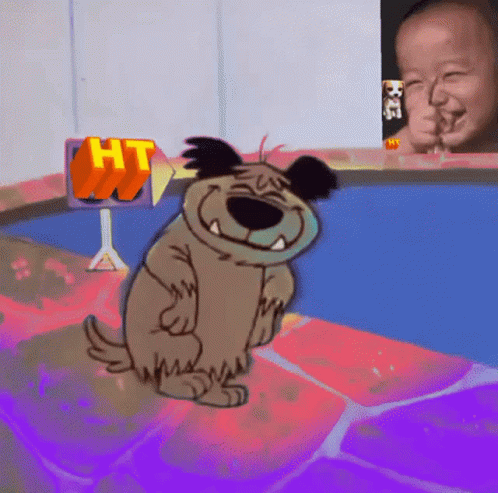 Ateu Muthey, the cartoon dog, changes expressions from sad to happy, laughing and dancing with a baby in the corner.