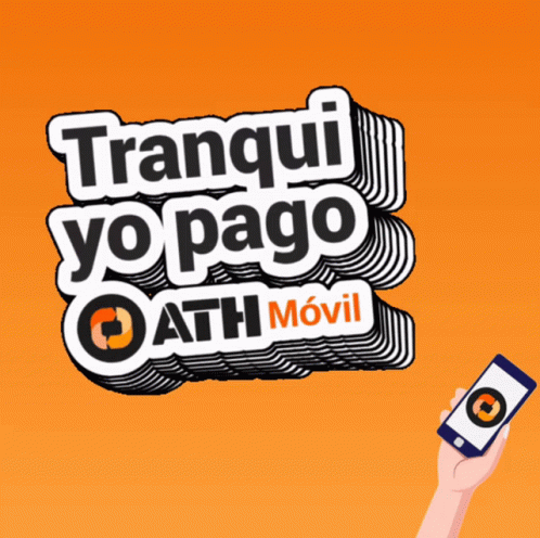 An animated hand holds a phone with the ATH Móvil app, displaying 'Tranqui yo pago' (Don't worry, I'll pay).