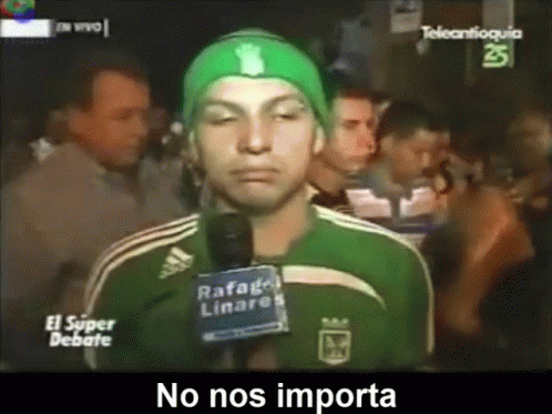 An animated Atlético Nacional fan, wearing a green beanie and jersey, declares 'No nos importa' (We don't care).