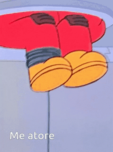 Cartoon character's feet in red suit and yellow boots are stuck in a spaceship hatch.