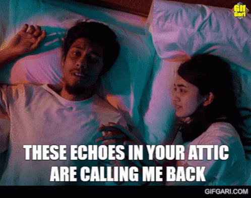 A man and woman lie in bed as the caption 'These echoes in your attic are calling me back' appears, referencing Attic The Band's song.