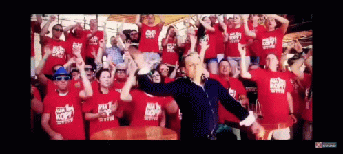 Tobee leads a lively crowd in red shirts, singing 'Aua Auaim Kopf' at a vibrant party.