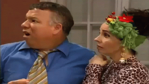 Arturo Suarez and Doña Magda (Macaria) react with disgust and shock in a scene from Vecinos.