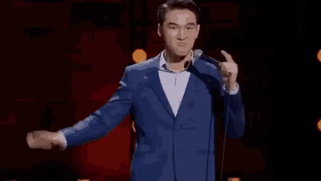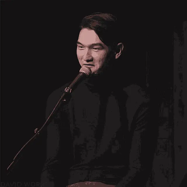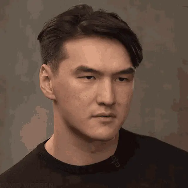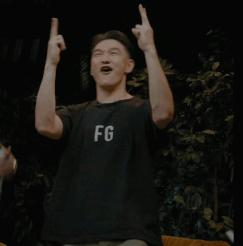 Nurlan Saburov reacting excitedly, raising hands with an open mouth, wearing a black 'FG' t-shirt.