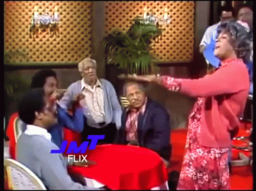 Aunt Esther dramatically performs for an audience gathered around a red table, with other characters reacting.