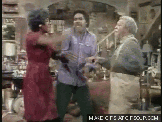 Aunt Esther performs a hilarious and energetic dance, entertaining a man and another woman in a lively living room scene.