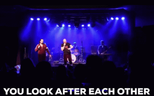 Aunty Donna and Broden Kelly perform live on stage, sharing the message 'YOU LOOK AFTER EACH OTHER' with the audience.