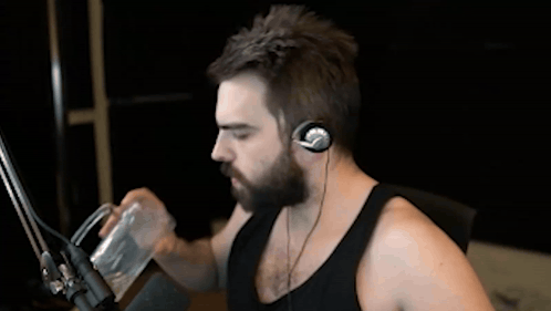 a man with a beard wearing headphones is drinking from a jar