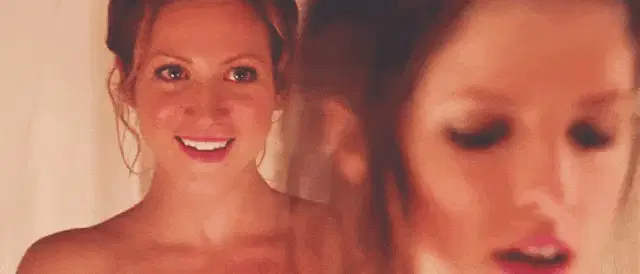 Arabella Kiesbauer in a silver sequined dress reacts with a surprised and then playful expression, pointing her finger.
