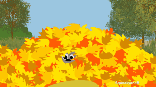 Squeaky and B emerge from a large pile of colorful autumn leaves, playing and having fun.