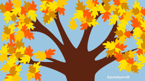 An animated autumn tree with colorful falling leaves against a blue sky, created by Squeakyandb.