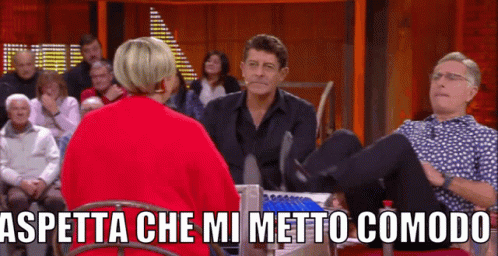 Paolo Bonolis gets comfortable on Avanti Un Altro, with the caption 'WAIT, I'LL MAKE MYSELF COMFORTABLE'.