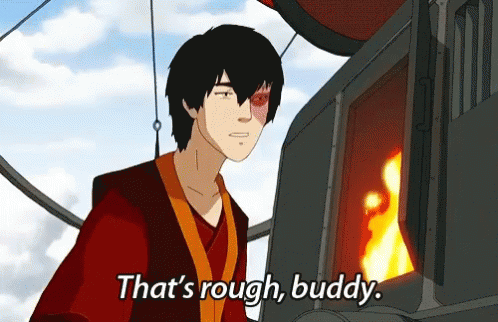 Zuko from Avatar: The Last Airbender delivers his iconic line, "That's rough, buddy," while standing by a fire.