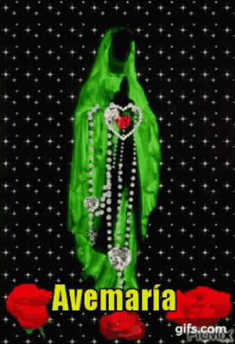 Animated image of the Virgin Mary with a glowing rosary, featuring the text 'AvemarÃa Alma'.