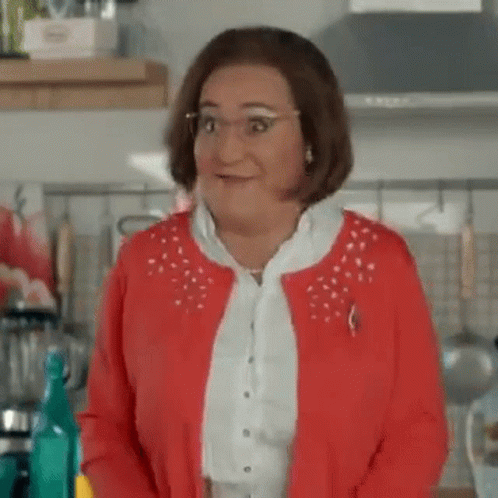 Avelina from 'Ella Es Tu Padre' is seen dancing excitedly in a kitchen, full of happy vibes.