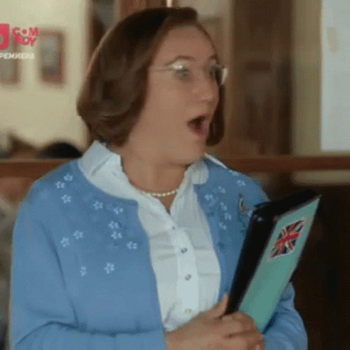 Avelina, the teacher from 'Ella Es Tu Padre', reacts with a shocked expression while holding a British flag folder.