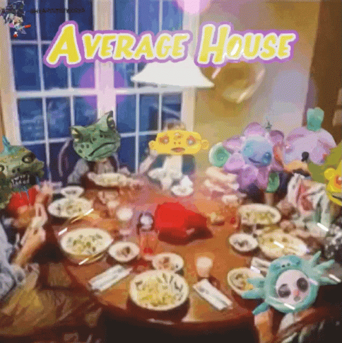 A painting by Heartstopworkshop featuring Average Creatures gathered around a table in an Average House.