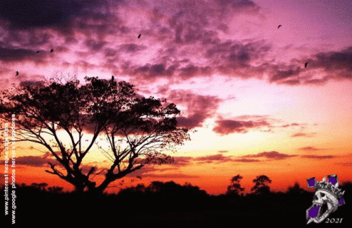 A vibrant sunset paints the sky in hues of pink and orange, with silhouetted birds flying over a tree.