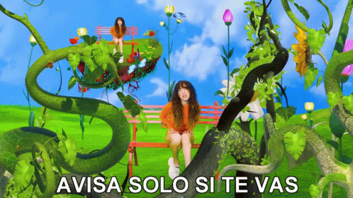 Dani performs 'Avisa Solo Si Te Vas' in a vibrant, whimsical garden setting with oversized plants.