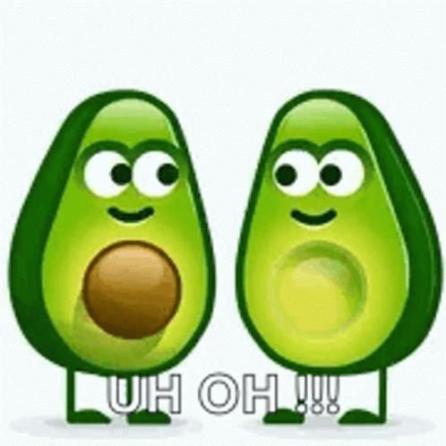 Animated avocado couple expressing various emotions, including surprise and love, with the text 'UH OH!!!' appearing.