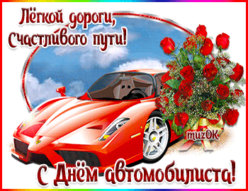 A vibrant red sports car is adorned with a large bouquet of red roses, celebrating Driver's Day with wishes for a happy journey.