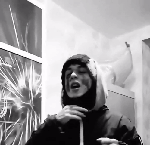 A person from Кишлак, wearing a hooded jacket and face paint, exhaling smoke in a black and white setting.