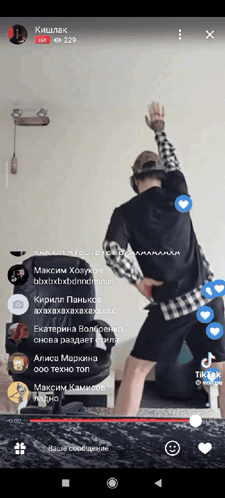 Максим Фисенко, known as Кишлак, performs a lively dance during a TikTok live stream, engaging with comments.