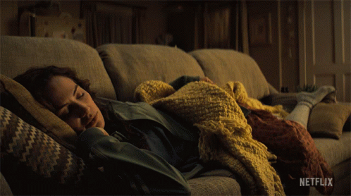 Erin Greene (Kate Siegel) wakes up suddenly on a couch, covered in blankets, from the Netflix series Midnight Mass.
