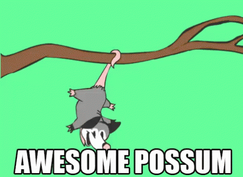 A cartoon opossum hangs upside down from a tree branch, smiling widely, with the text 'Awesome Possum' displayed.