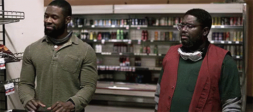 Two men in a grocery store share an awkward moment, one fidgeting and wiping his brow.