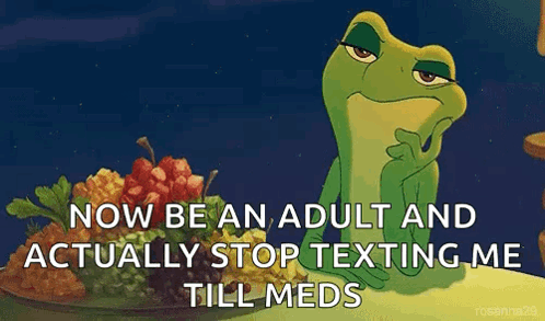 Prince Naveen as a frog from The Princess and the Frog, with a meme overlay: 'NOW BE AN ADULT AND ACTUALLY STOP TEXTING ME TILL MEDS'.