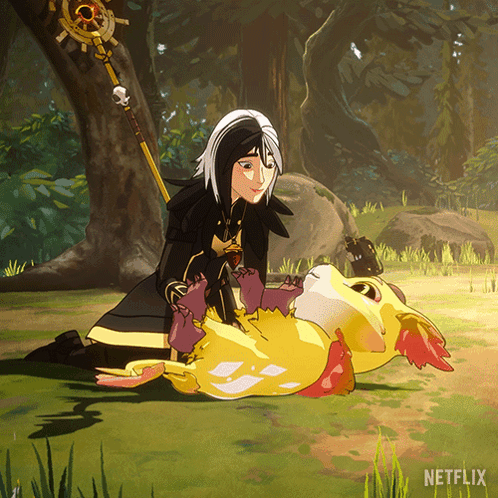 Claudia from The Dragon Prince interacts playfully with a cute, yellow creature, showing affection in a forest setting.