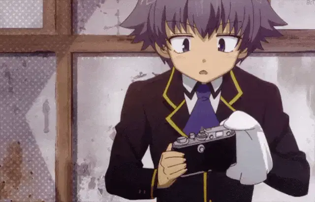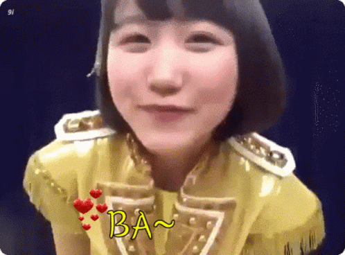 Kimino smiles and playfully says 'BA~ KA' with heart emojis, wearing a bright yellow outfit.