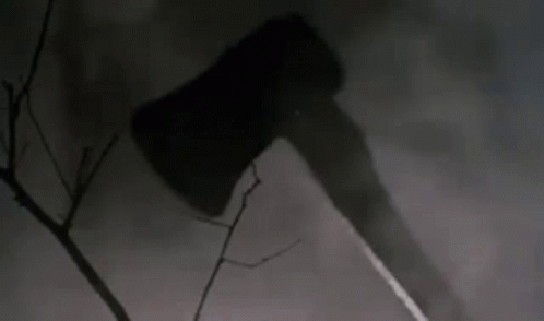 A large axe is silhouetted against a tree branch, shrouded in smoke and darkness.