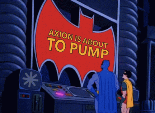 Batman and Robin in the Batcave react to a Bat-Signal displaying 'Axion Is About To Pump'.