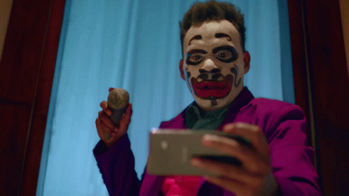 A man wearing a creepy Joker-style clown mask holds a phone and a rock, looking intently.