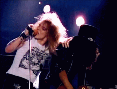 Axl Rose passionately singing into a microphone on stage, with Slash visible beside him.