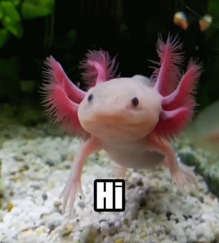 A friendly pink axolotl with feathery gills stands in an aquarium, greeting viewers with a 'Hi' message.
