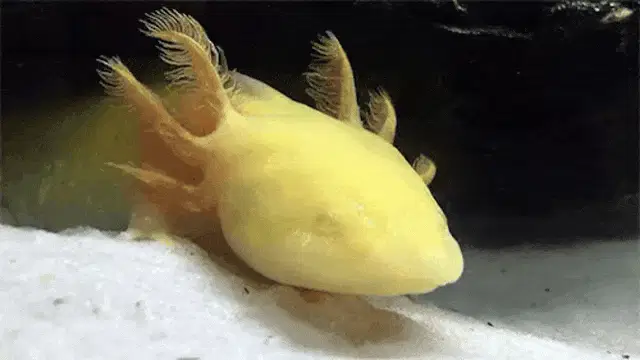 A cute axolotl with pink gills smiles and opens its mouth wide, showing its happy expression.