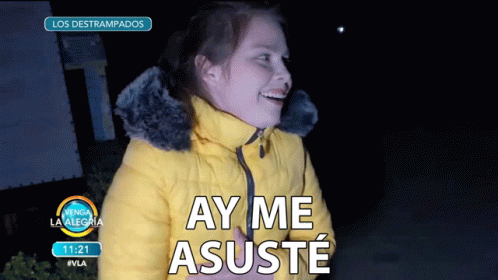 A woman in a yellow jacket exclaims "Ay me asusté" (Oh, I got scared) on the Mexican TV show Venga La AlegrÃa.