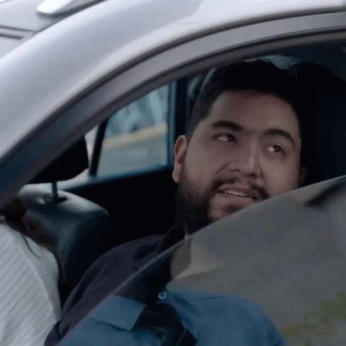 Daniel García in a car, looking surprised or reacting to something outside the window.