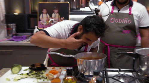 A chef in an apron smells a pot of food, exclaiming "¡Ay Papa!" with excitement during a cooking show.
