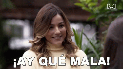 Vivian Roldan, from La Nieta Elegida, smiles and says 'Ay Que Mala!' while wearing a yellow sweater.