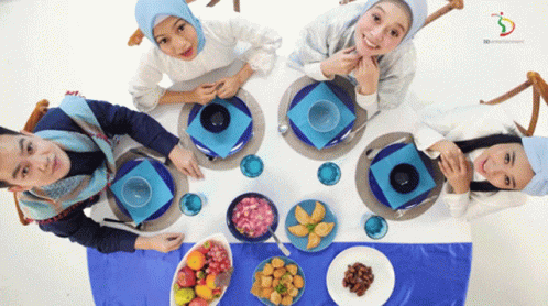 Faul, Rara, Lesti, and Aulia gather for a joyful meal, smiling at the camera during a festive occasion.
