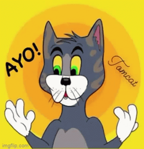 Tomcat cartoon character with a surprised expression, featuring the text 'Ayo!' on a bright yellow background.